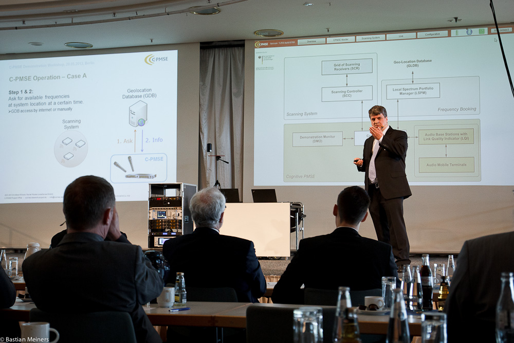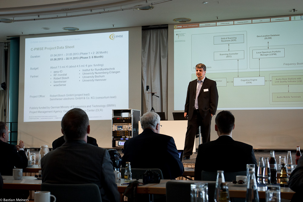 Im Mai 2010 versteigerte die Bundesnetzagentur den UHF-Frequenzbereich von 790 – 862 MHz für neue Mobilfunkanwendungen. Dieser Frequenzbereich wird künftig für die drahtlose Sprach- und Musikübertragung bei Kultur-, Sport- und Musikveranstaltungen, TV Shows, Musicals, Konferenzen und Präsentationen nicht mehr zur Verfügung stehen. Das Ziel des vom BMWi geförderten Projektes C-PMSE ist es, trotz zunehmender Nutzerdichte, eine störungsfreie Übertragung mit drahtlosen Mikrofonen zu erreichen. Dieses soll durch ein intelligentes, automatisiertes Verfahren, welches als ‚cognitive radio’ bekannt ist, realisiert werden. Die Grundidee hierbei ist, den zu nutzenden Frequenzbereich für eine bestehende Mikrofonstrecke ständig nach potentiellen Störern abzusuchen. Bei einer drohenden Störung sollte dann unmittelbar die Veränderung der Übertragungsfrequenz für diese Strecke erfolgen. Das Prinzip klingt einfach, erfordert aber ein sehr komplexes Zusammenspiel unterschiedlicher Komponenten. Diese sind zum Teil noch Gegenstand der jüngeren Forschung und somit noch nicht kommerziell erhältlich.